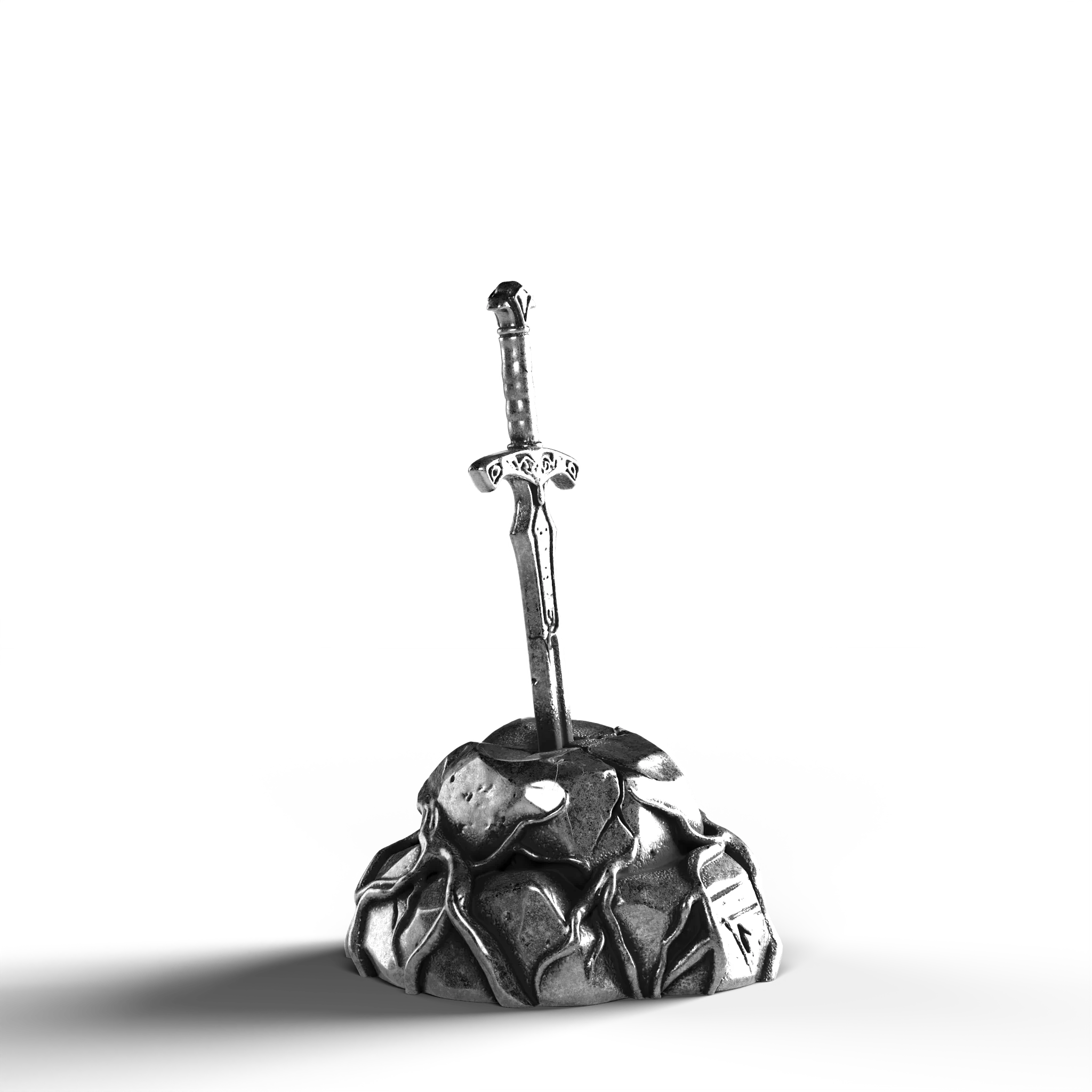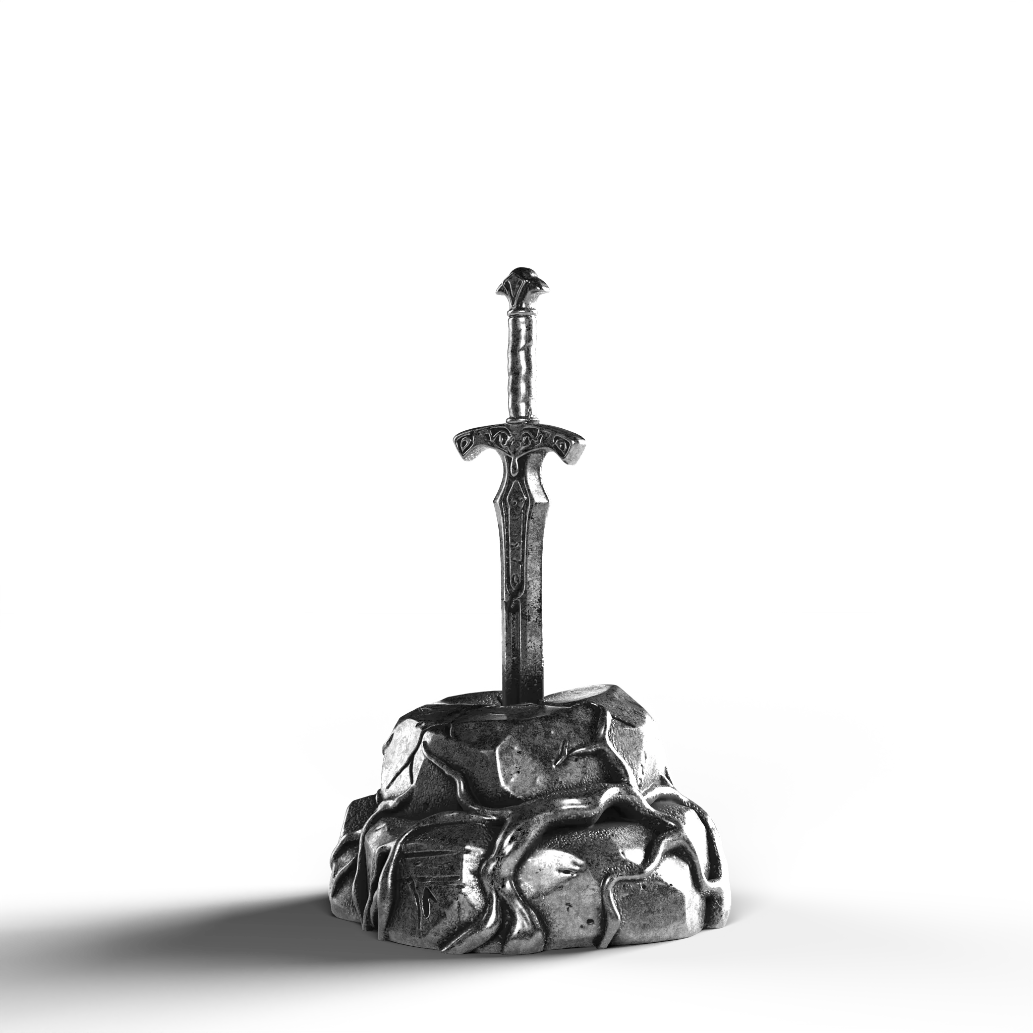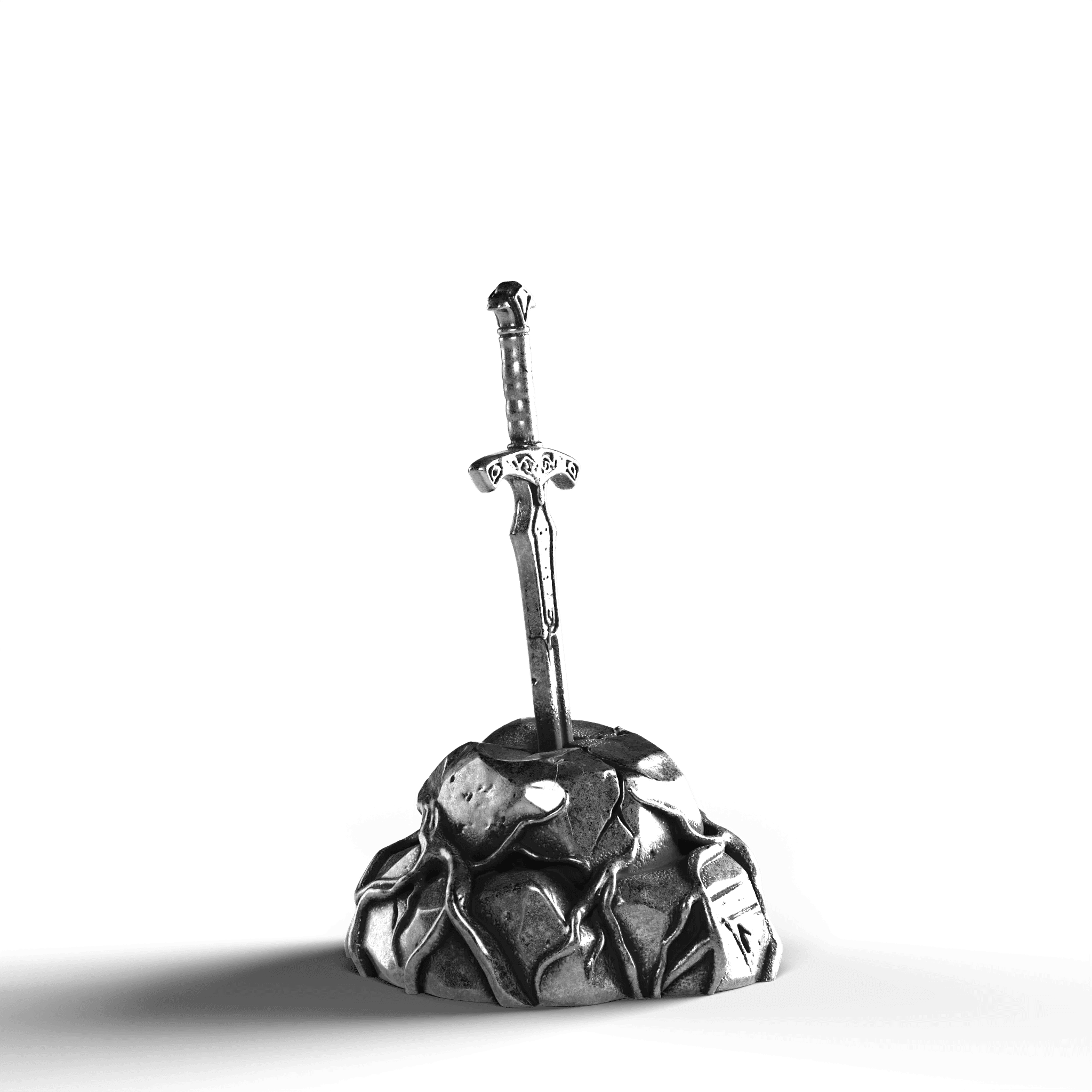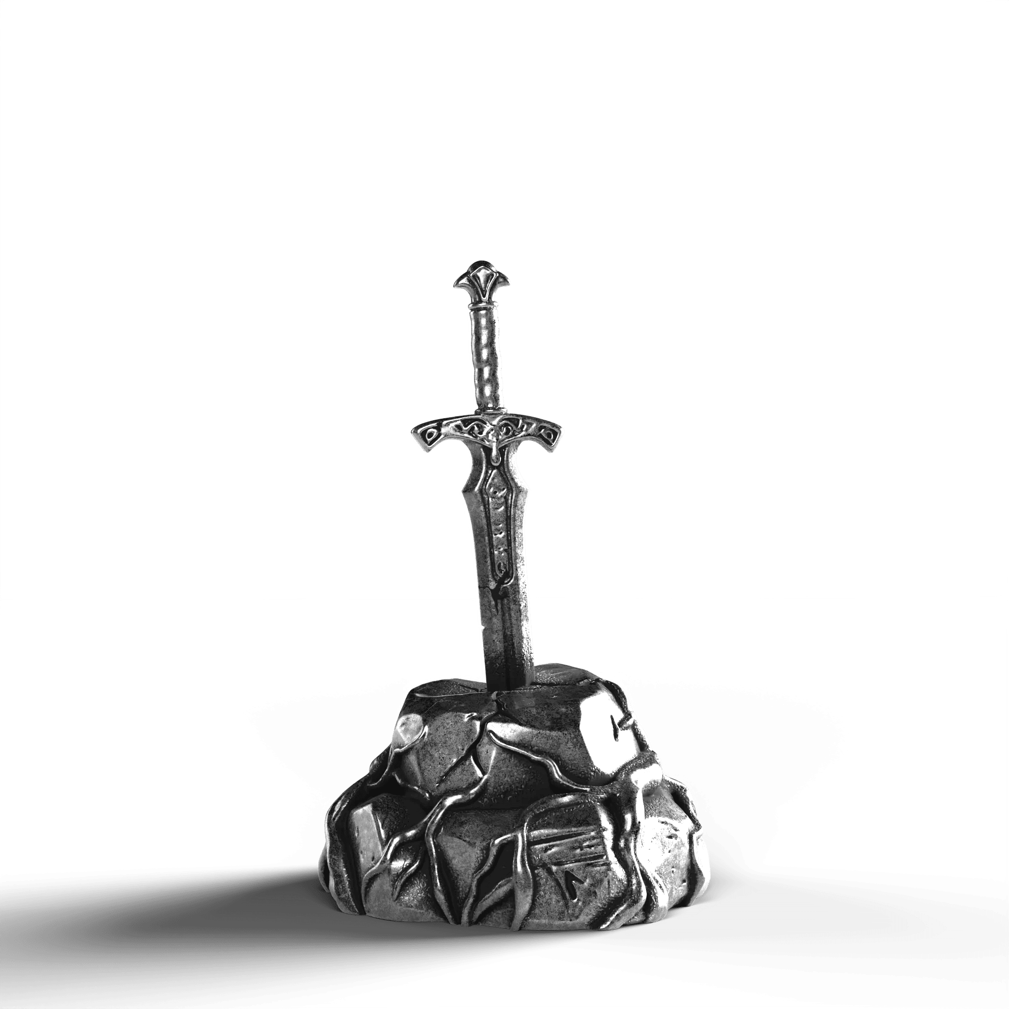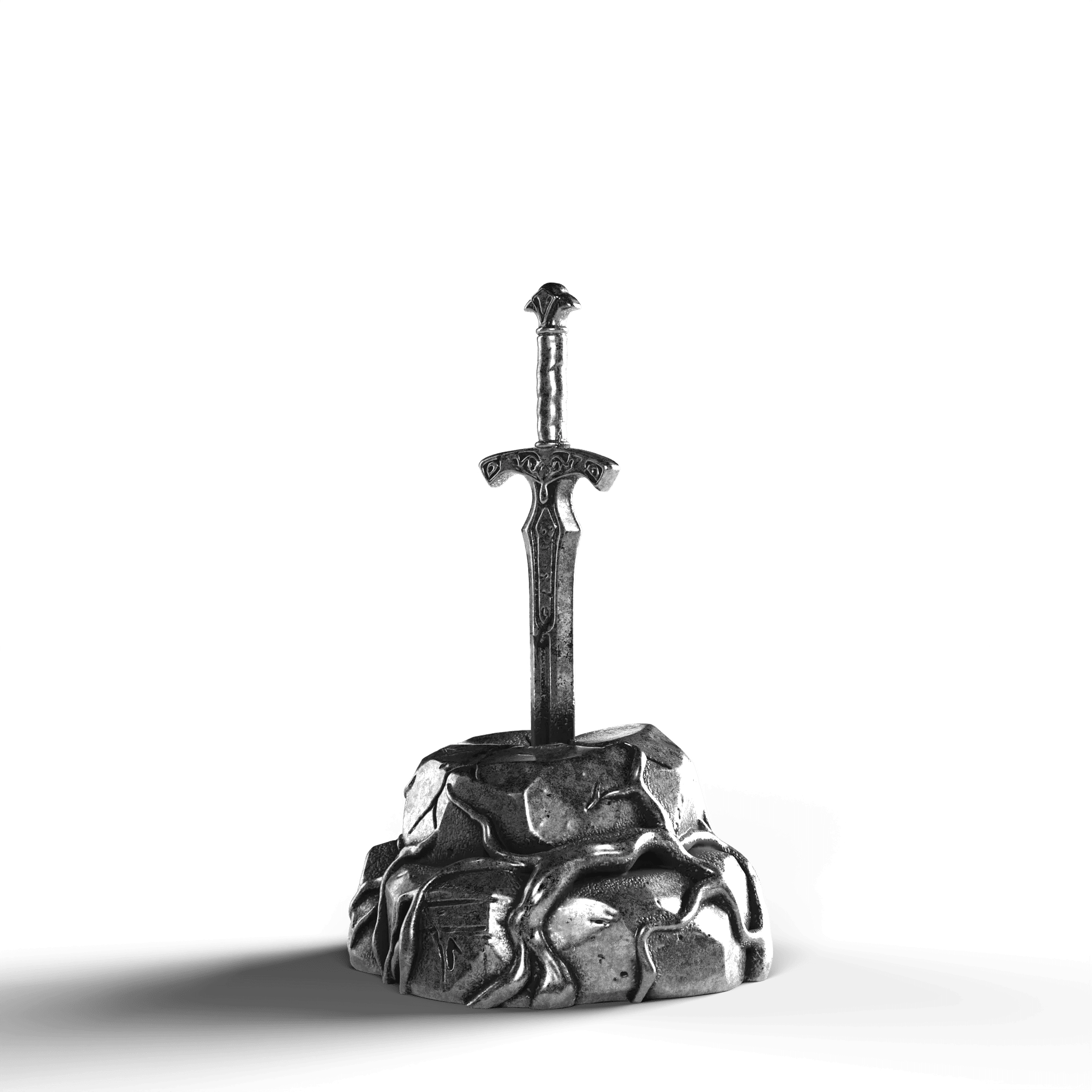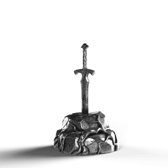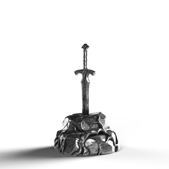 - Exquisite Craftsmanship: The sword's hilt is adorned with ornate engravings, each line and curve expertly rendered. The texture of the stone base is meticulously sculpted, offering a natural, rugged appearance.