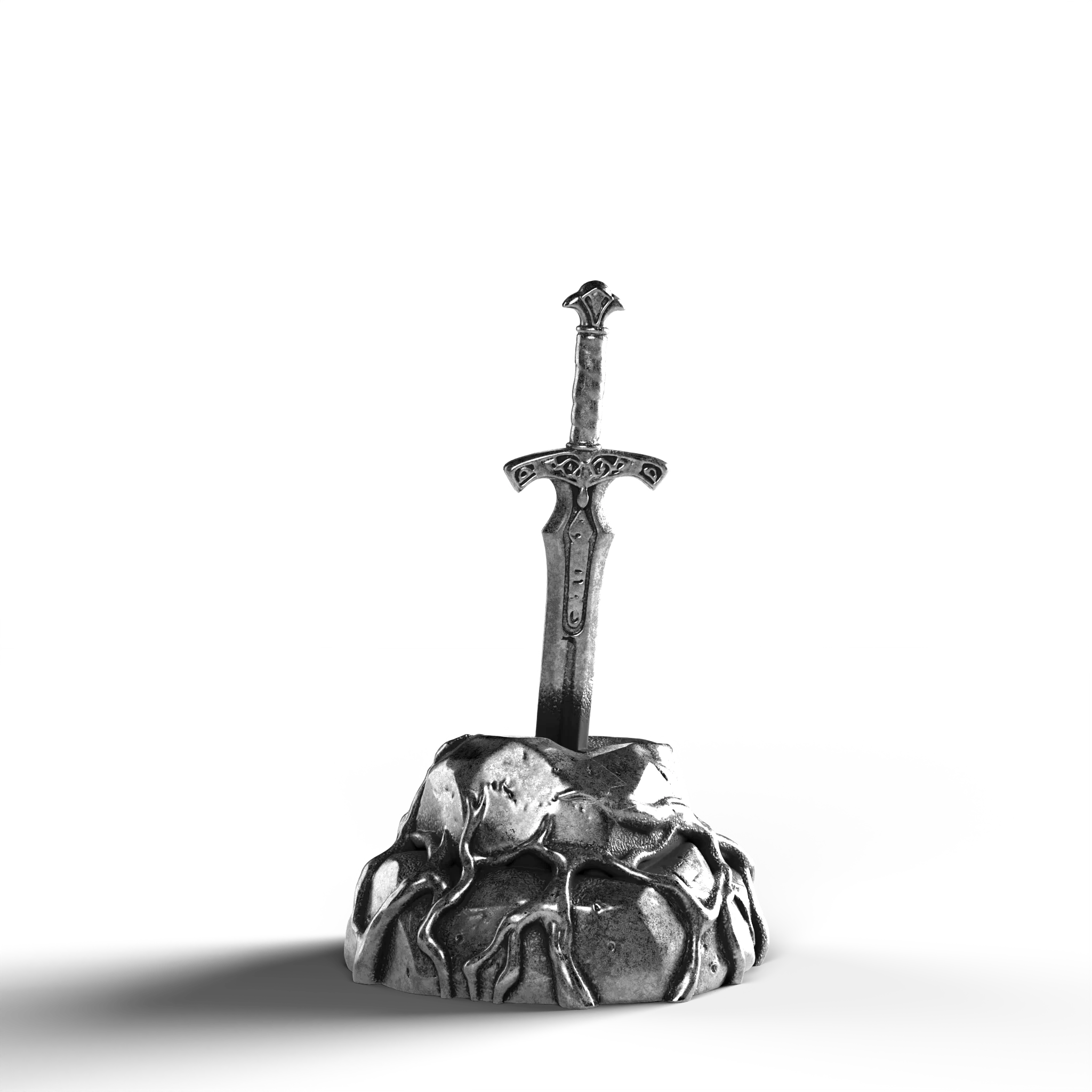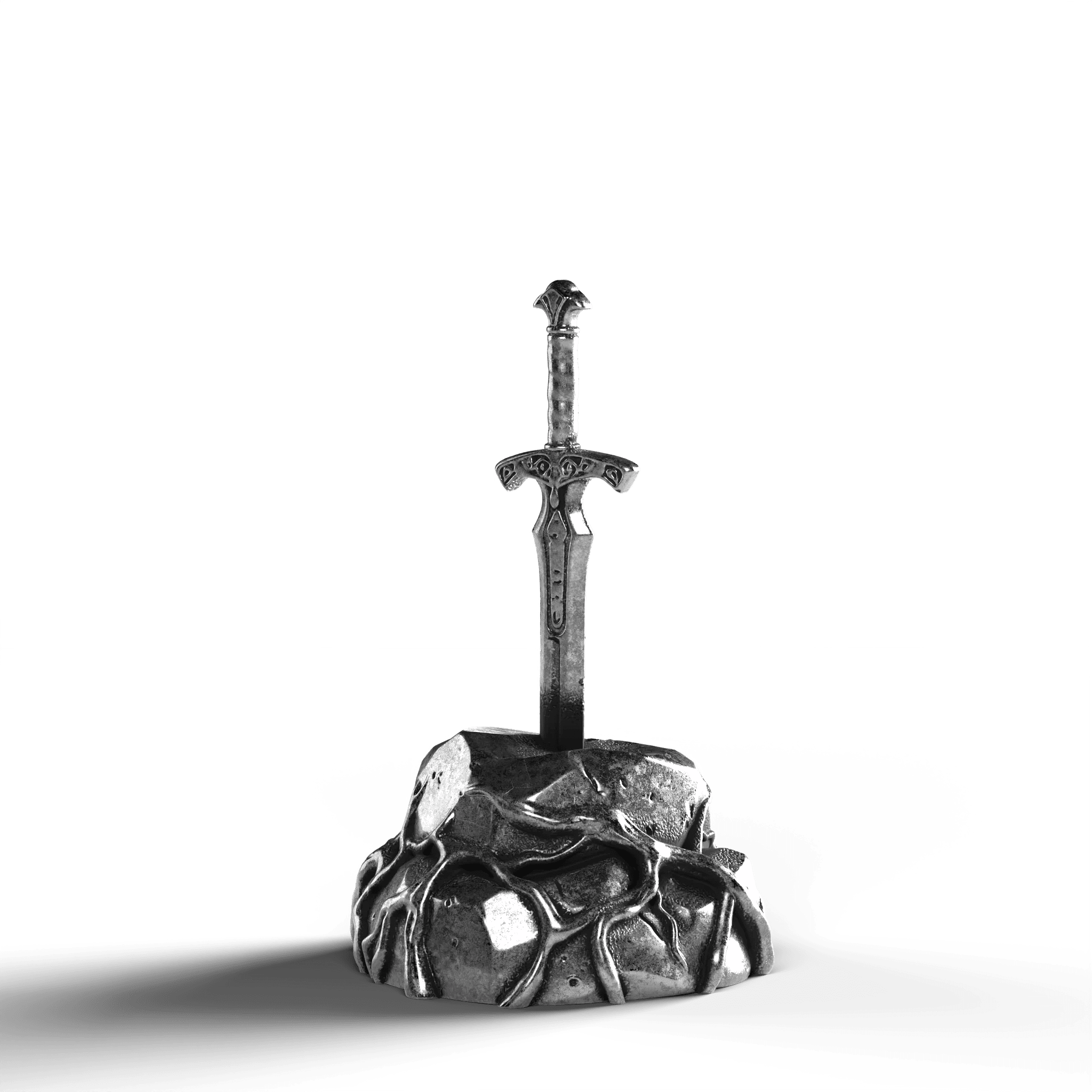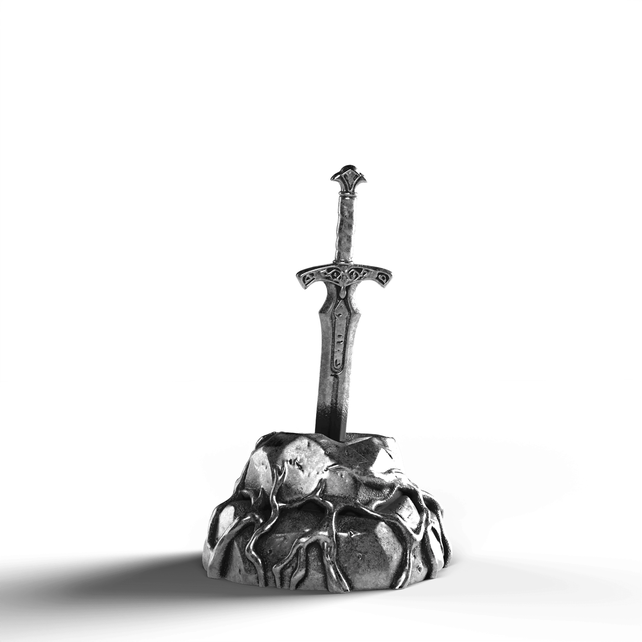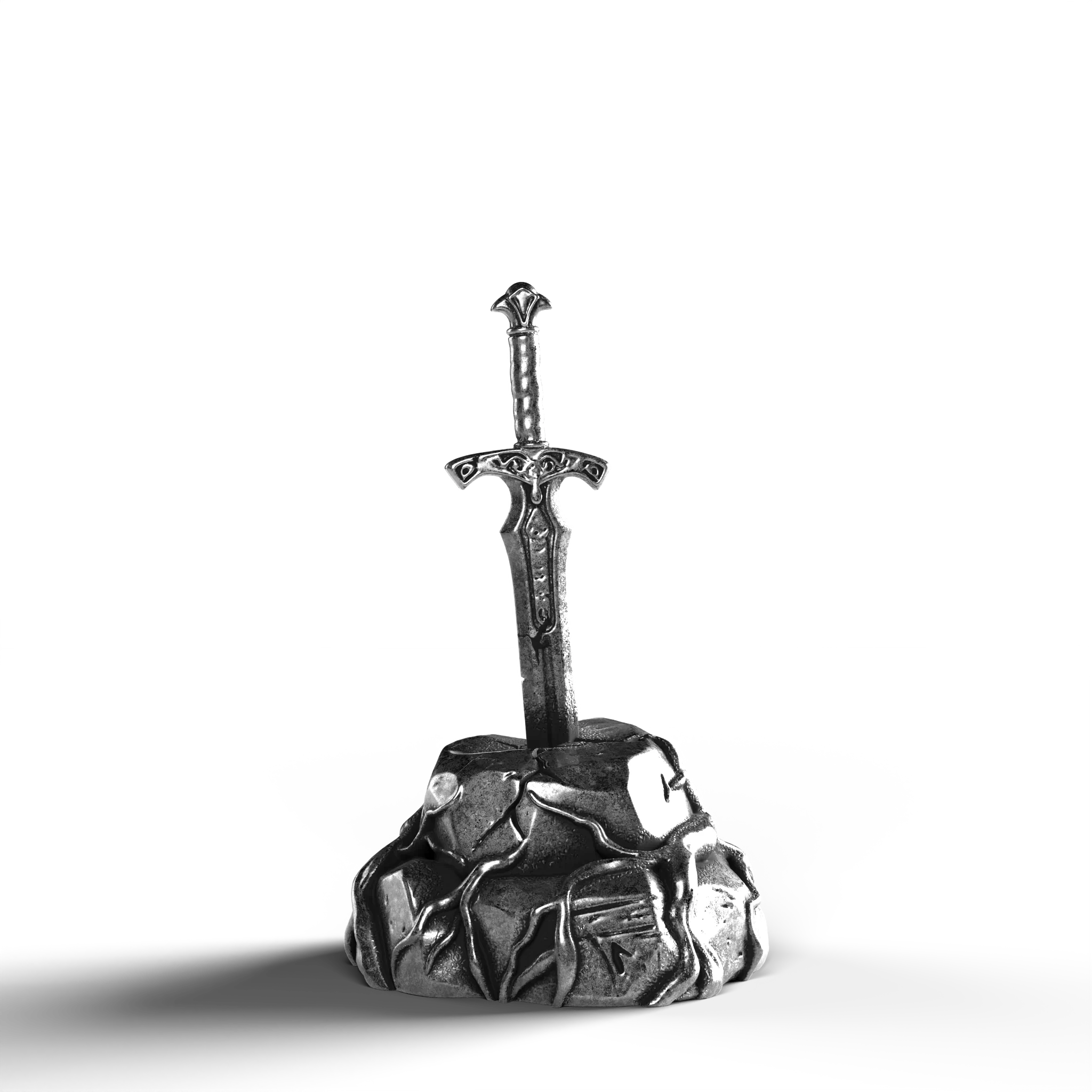 - Exquisite Craftsmanship: The sword's hilt is adorned with ornate engravings, each line and curve expertly rendered. The texture of the stone base is meticulously sculpted, offering a natural, rugged appearance.