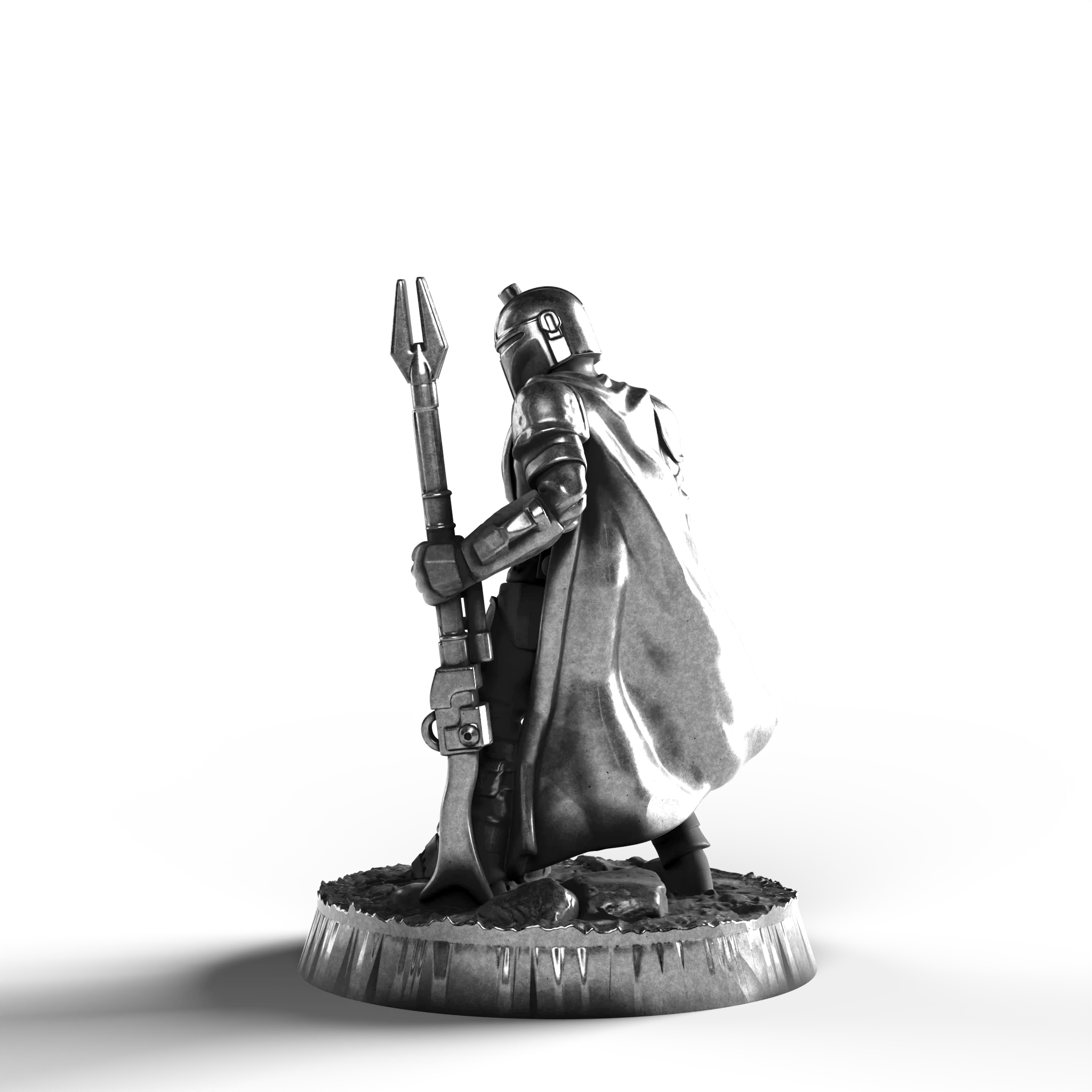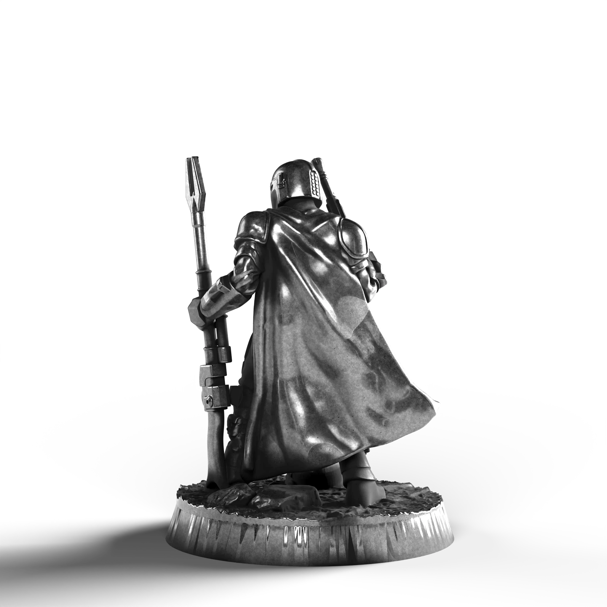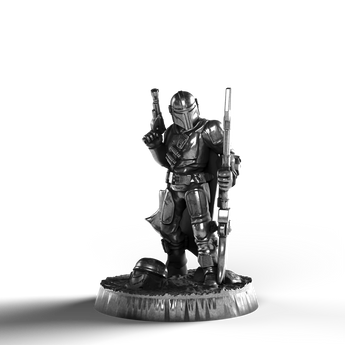 • Exquisite Craftsmanship: The figure's armor is intricately detailed, showcasing finely etched plates and a flowing cape that cascades with dynamic realism. The Mandalorian holds his weapon with silent determination, every facet capturing his warrior spirit.