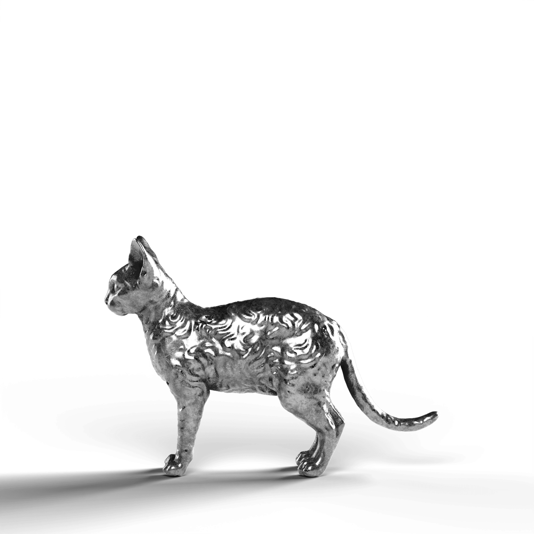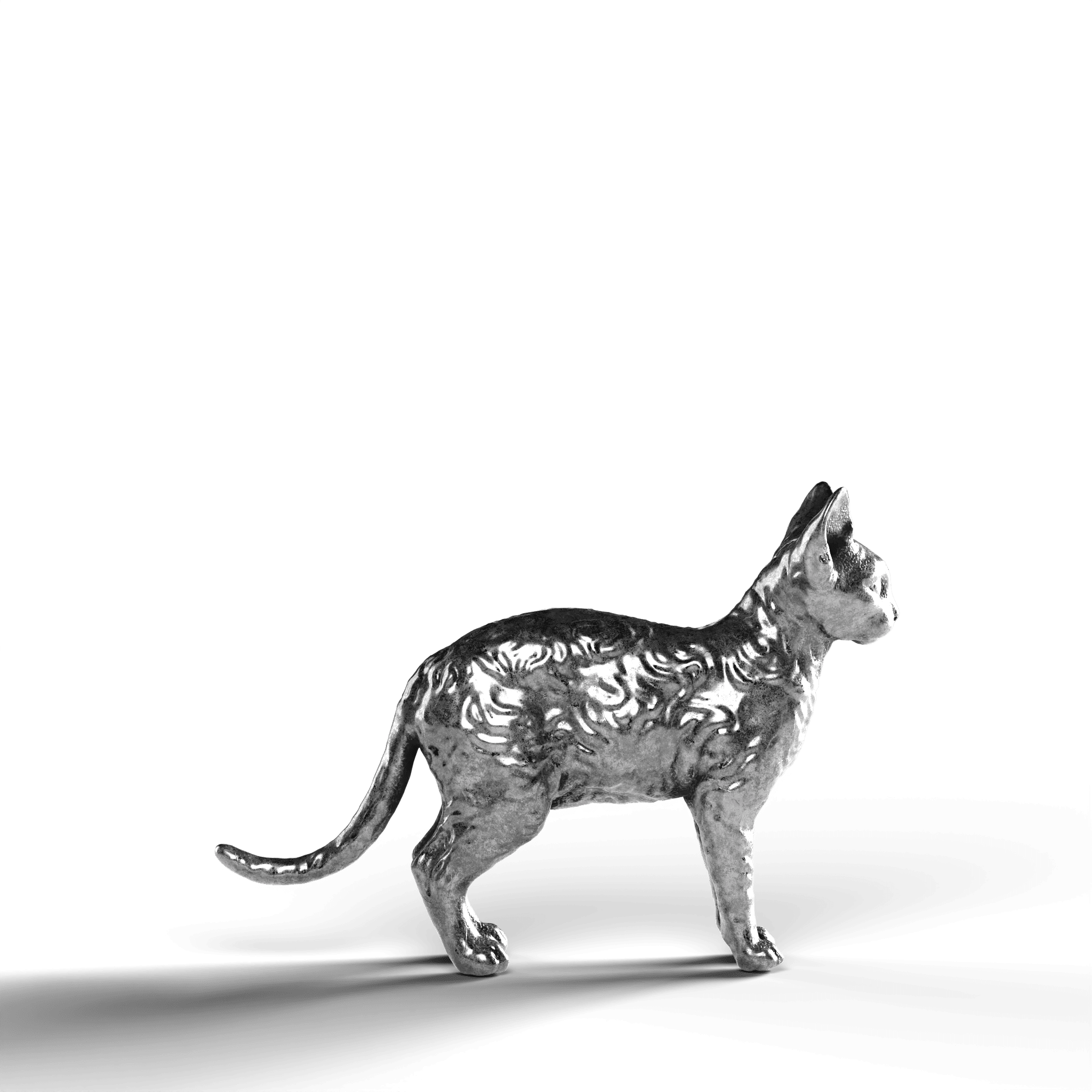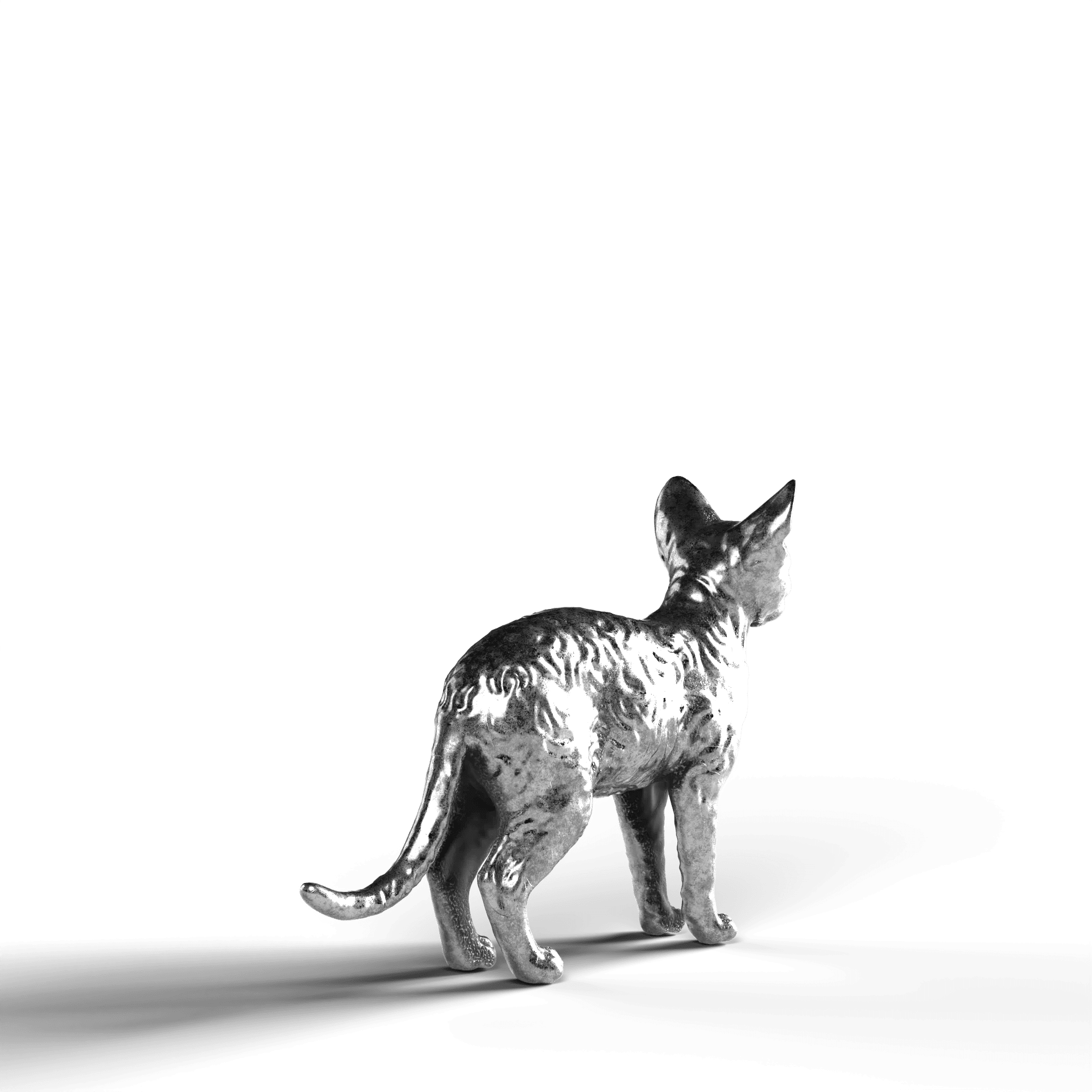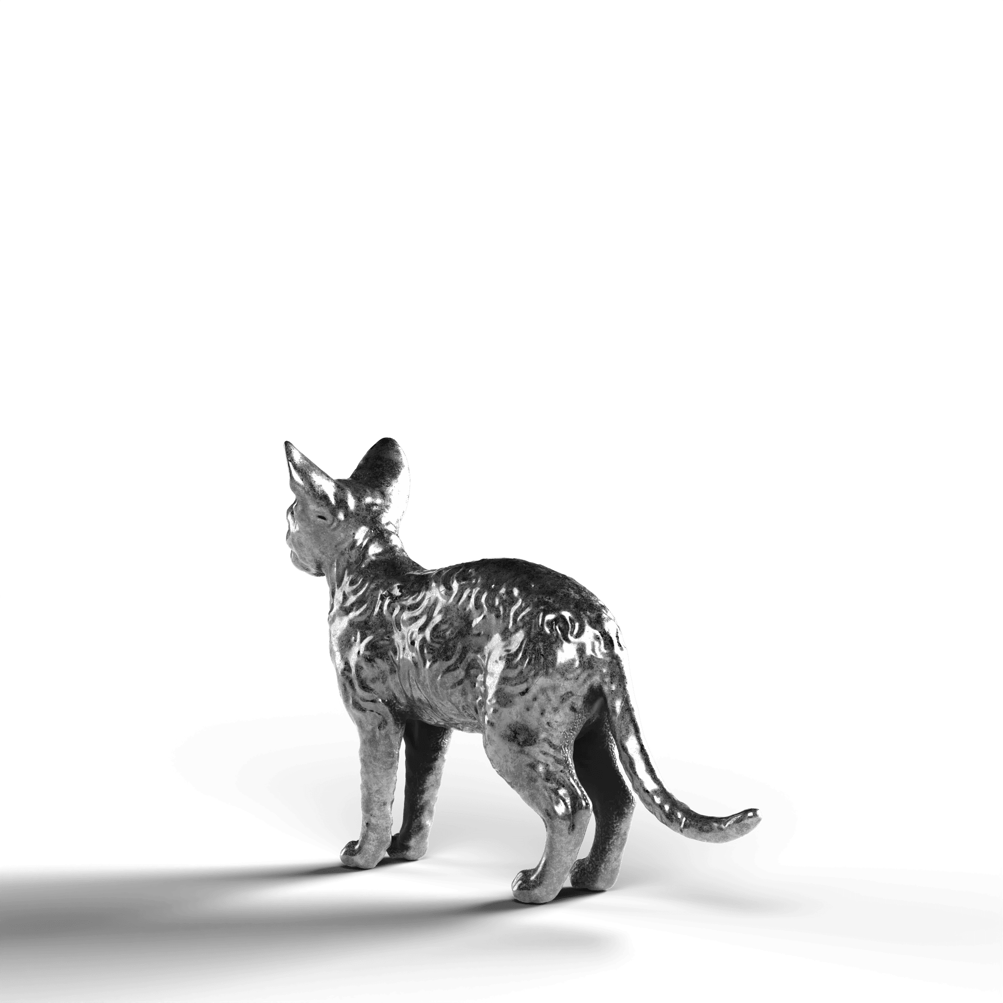 • Exquisite Craftsmanship: The statue showcases the Devon Rex’s distinctively large ears and curled coat with intricate detail. The lifelike texture of the fur contrasts with the sleekness of its silver surface, capturing the cat’s curious and attentive stance.